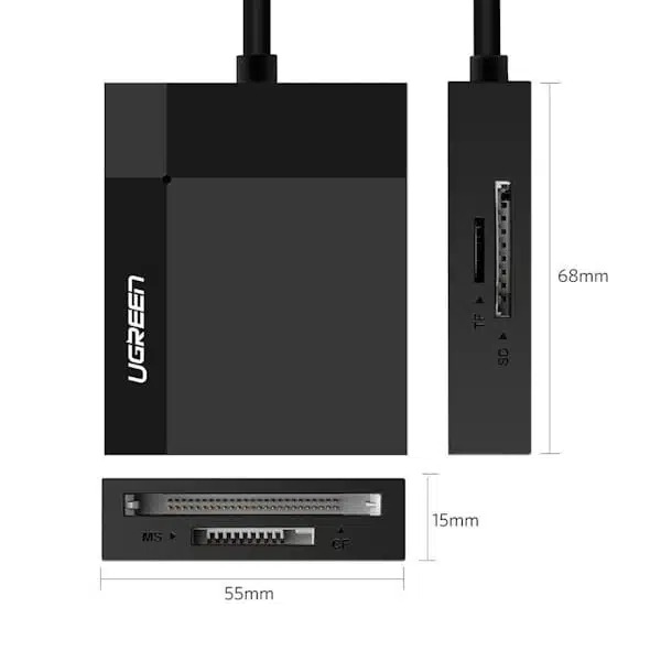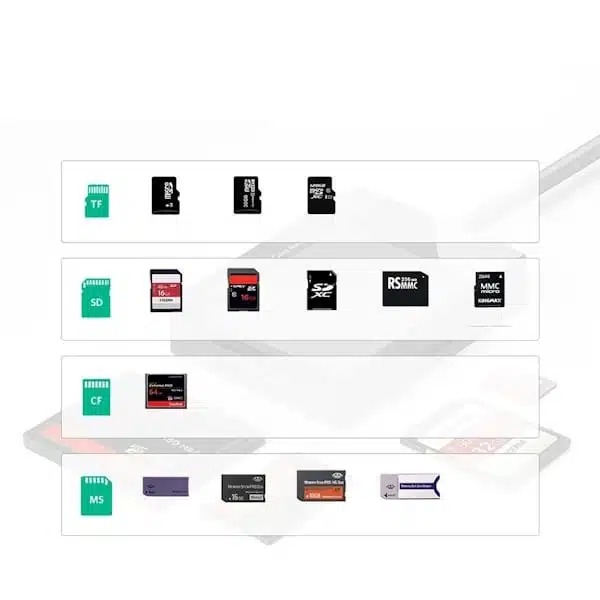 این کارت خوان SD از نوع USB-C با اسلاتهای SD/Micro SD/CF/MS طراحی شده و از اکثر کارتهای حافظه استاندارد، از جمله SD/SDXC/SDHC/Micro SD(TF)/Micro SDXC/Micro SDHC/UHS-I/Compact Flash/Memory Stick پشتیبانی میکند.