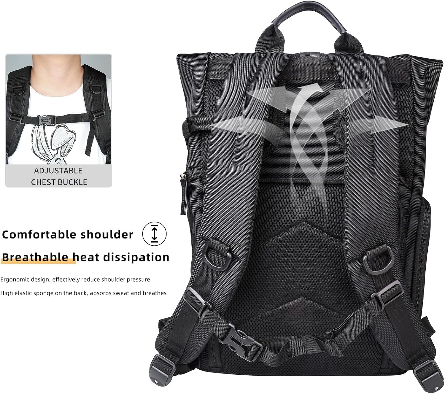 ① یک کیف، دو کاربرد، قابل تعویض به دلخواه: کیف دوربین، محفظههای داخلی، ترکیب رایگان، به راحتی با ۱ دوربین و چندین لنز پر میشود؛ کیف تفریحی، محفظه لپتاپ ۱۶.۱ اینچی؛② قابلیت انبساط بالا، با توجه به نیاز کاربر برای افزایش فضا، ارتفاع انبساط تا ۱۵ سانتیمتر؛③ پارچه پلیاستر ضد آب و مقاوم در برابر پارگی؛④ بندهای شانهای با طراحی ارگونومیک، به طور موثر فشار روی شانه را کاهش میدهند؛⑤ حمل آسان سهپایه در کنار کیف دوربین، آزاد بودن دستها